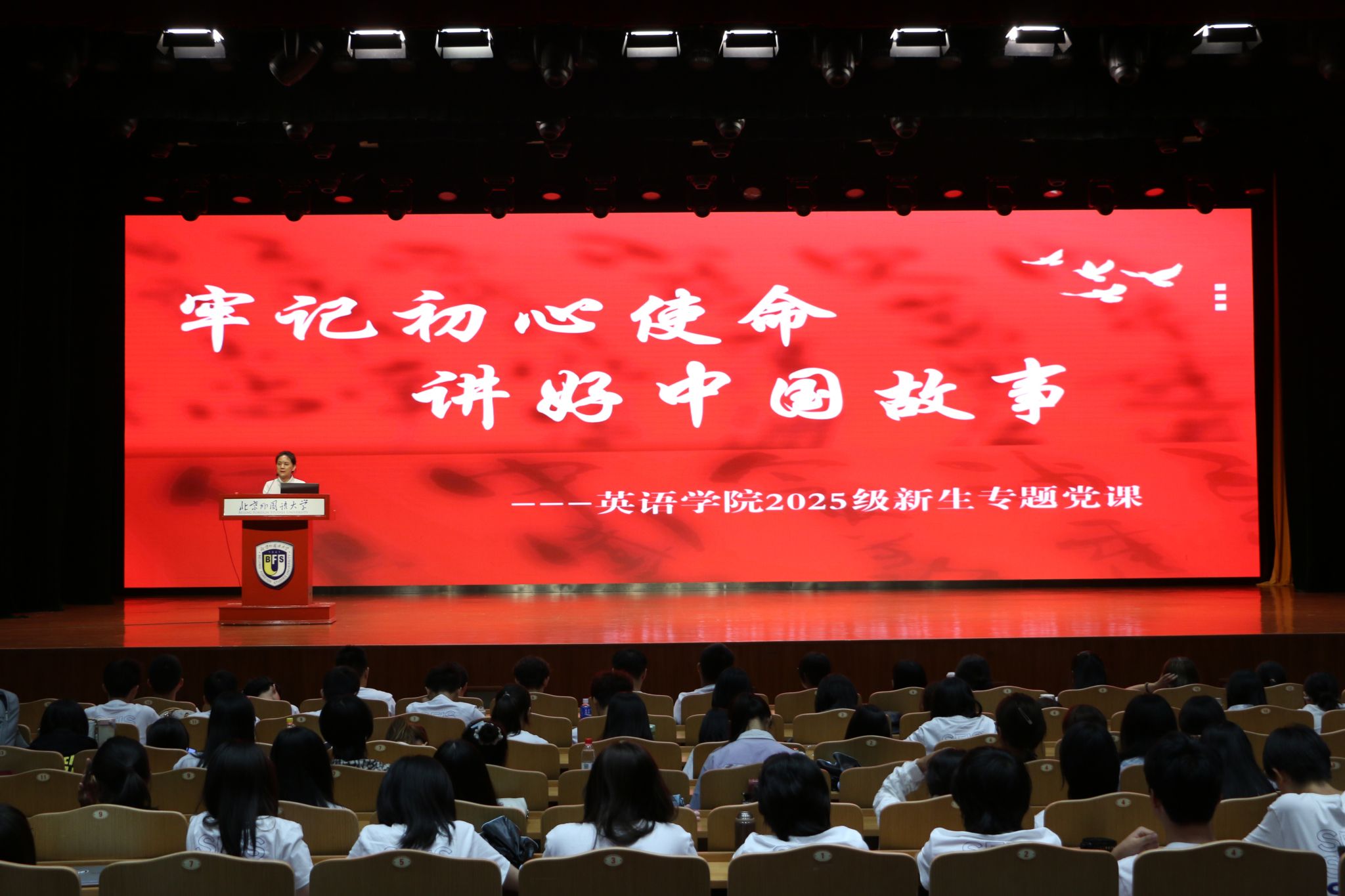 9月5日下午,在Beat365唯一官方网站2025级新生开学典礼最后,学院党总支书记殷悦以“牢记初心使命,讲好中国故事”为题,为全体2025级本科生及研究生新生讲授专题党课。