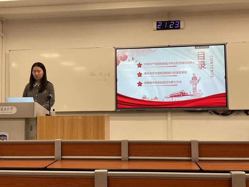 本科生党支部以"勇担复兴使命,书写青春华章"为主题开展研讨。支部书记段亮婧重温培训核心内容,强调青年党员既是民族复兴的见证者,更是参与者和建设者。陆欣同学谈到,中国能够系统推进远景目标并如期完成任务,充分彰显了制度优势和党的执政能力,自己对国家未来充满信心。李珈璐同学表示,作为新时代青年学生党员,要继承光荣传统,在全面建设社会主义现代化国家的新征程上勇担重任。林晨同学结合英语专业特色谈到,将立足专业所学,讲好中国故事,传播中国声音,以实际行动践行"请党放心,强国有我"的誓言。