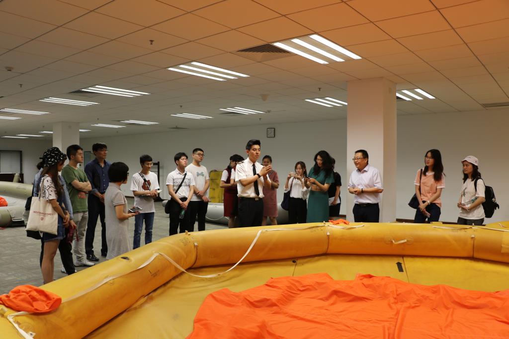 讲座结束后,国航乘务训练中心的李鑫经理带领同学们参观了国航乘务员日常训练的舱室。同学们近距离接触了服务训练舱中的四节模拟训练舱,兴致勃勃地体验了“豪华头等舱”中舒适的座椅,参观了水上训练厅,了解了为确保跨水飞行安全而采取的一系列防范措施,学习了充气救生船的构造以及如此设计的深层原因。最后同学们登上飞机模拟动舱,在训练指导员的带领下身临其境地体验了在飞机飞行过程中遇到着火、气压过低、水上迫降等情况时正确的处理方法,也学会了如何在紧急迫降情况下有序、正确地使用充气滑梯进行安全撤离。