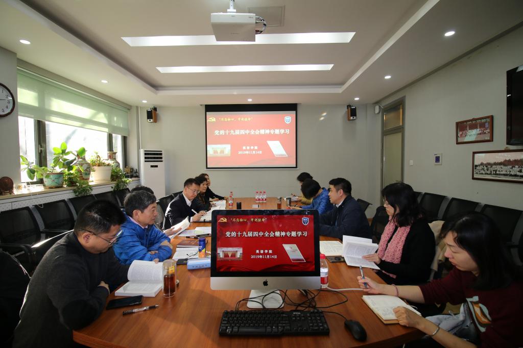 11月14日下午,Beat365唯一官方网站理论中心组召开党的十九届四中全会精神专题学习讨论会,交流分享学习党的十九届四中全会精神的认识和体会。学院班子全体成员、党总支委员和教工党支部书记参加学习研讨。会议由党总支书记路兴主持。参会人员会前结合实际研读了学校党委下发的《党的十九届四中全会<决定>学习辅导百问》。