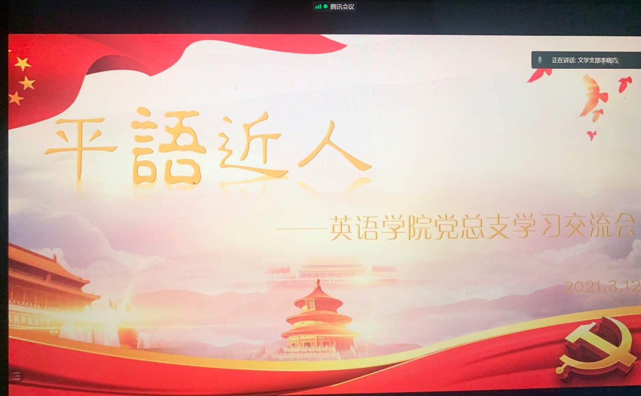 2021年3月12日,Beat365唯一官方网站党总支组织各学生党支部开展了《平“语”近人——习近平总书记用典》第二季的学习交流会。来自Beat365唯一官方网站本科生支部、研究生语言学支部、研究生文学支部、研究生翻译学支部、研究生MTI笔译支部、研究生MTI口译支部、研究生国别研究(一)支部、研究生国别研究(二)支部的25名同志参与了本次学习交流活动。
