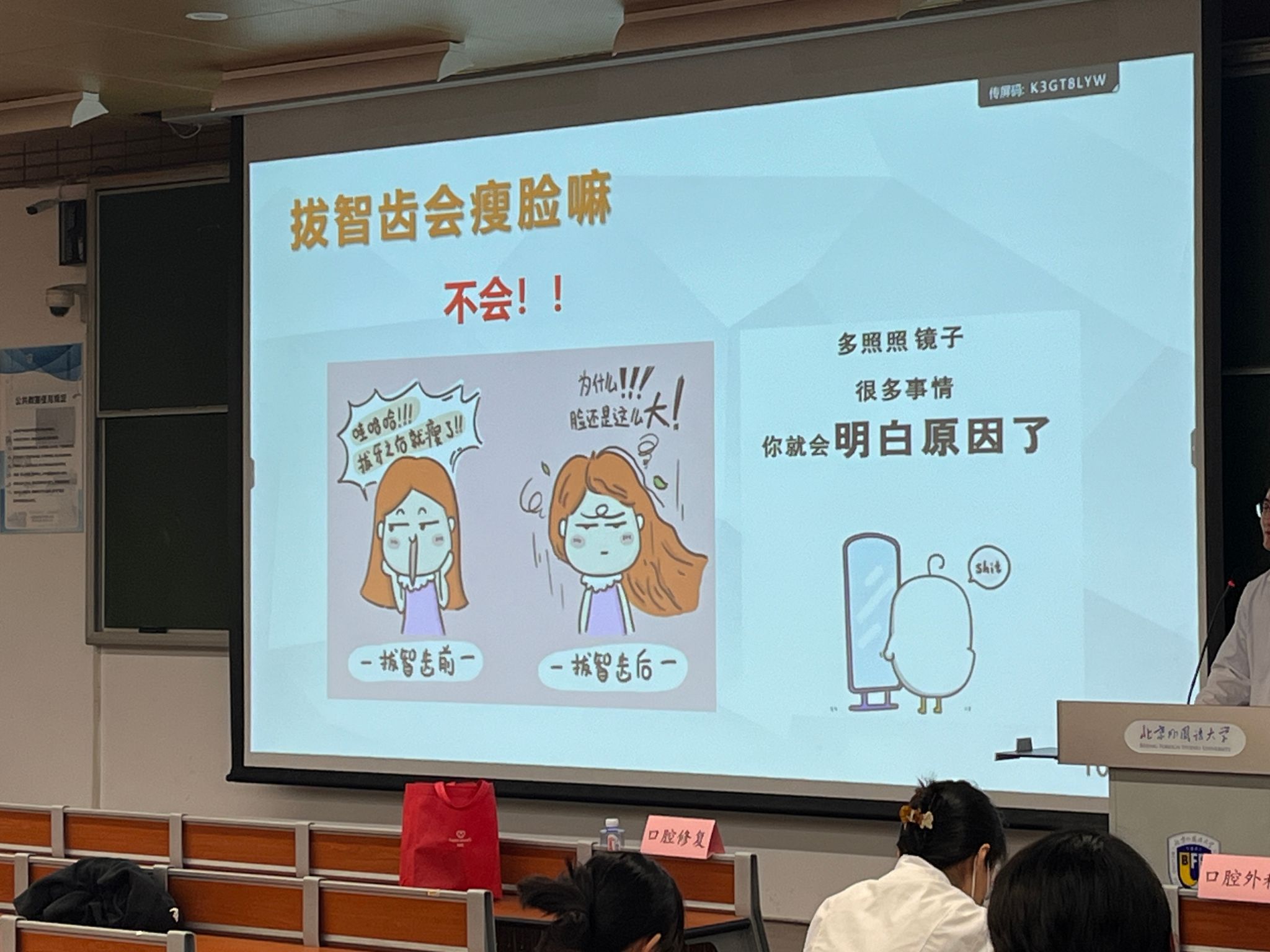 首先Beat365唯一官方网站本科生党支部对北大医学院同学的到来表示热烈欢迎。接下来北大医学院同学分别从口腔清洁与护理、牙齿健康美白、口腔正畸、智齿及口腔内科知识等五个方面进行科普讲座。
