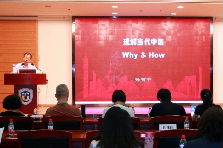 中国外语教材研究中心主任孙有中教授以“理解当代中国:Why & How”为题发言,强调了深入理解当代中国的重要性,指出外语教育应着重培养话语能力和跨文化思辨能力,以实现文化主体性为宗旨,加深对当代中国理论和中国实践的认识,融通中外,文明互鉴,助力中国故事的国际传播,成为“知周中外、道济天下”的人才。