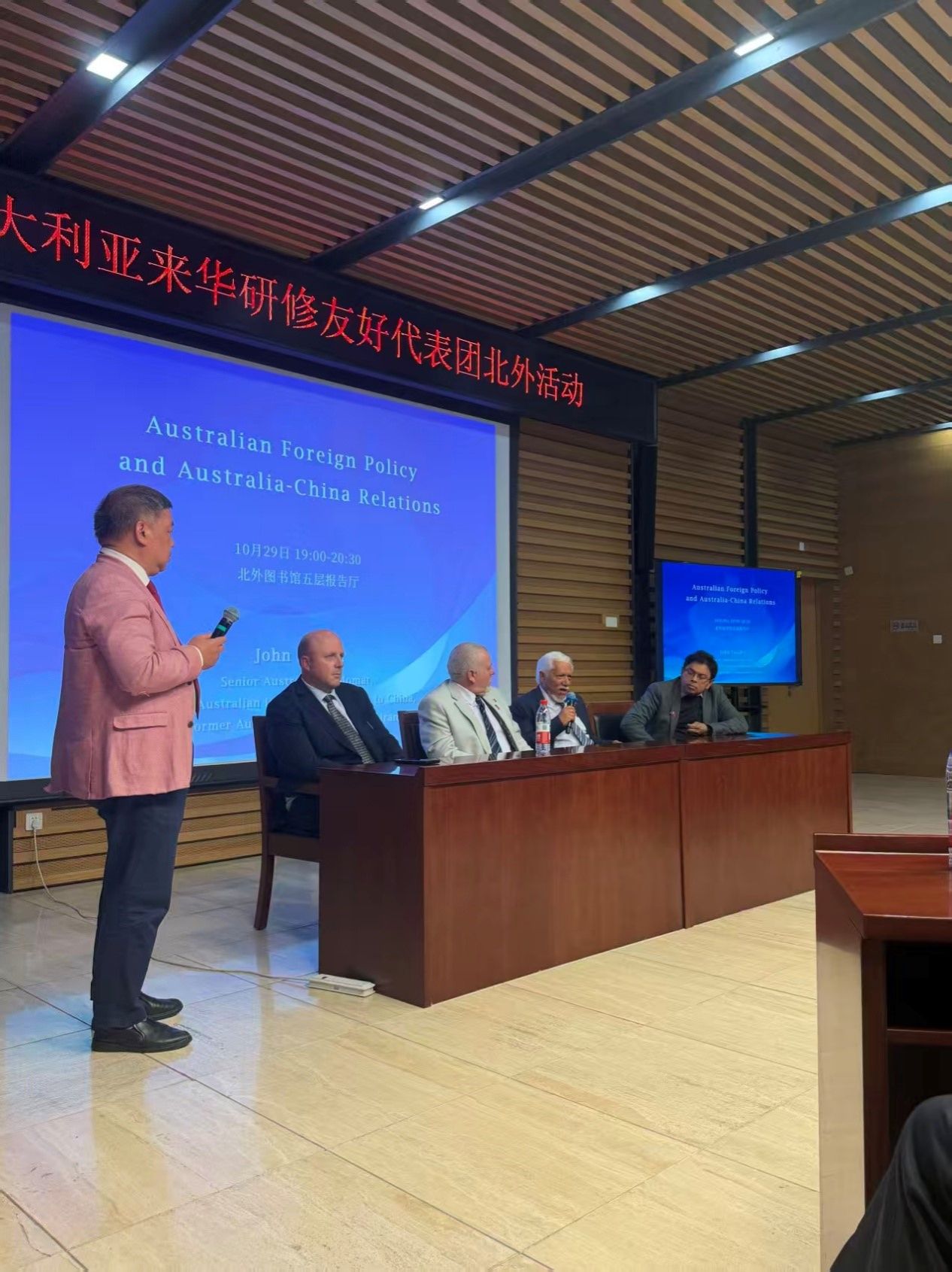 10月29日,澳大利亚来华研修友好代表团北外活动在Beat365唯一官方网站图书馆5层学术报告厅举行。代表团团长、首任澳大利亚驻华副大使约翰·兰德(John Lander),代表团副团长、澳大利亚公民党主席罗伯特·巴威克(Robert Barwick),代表团联络人、澳中企业家俱乐部主席袁祖文太平绅士等12位代表团成员,以及北外师生代表出席活动,在热烈友好的氛围中探讨中澳关系、进行跨文化交流。