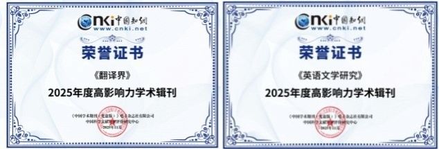 近日,中国知网在2025年度学术影响力评价系列报告发布会上正式公布“2025年度高影响力学术辑刊”名单。在此次评选中,Beat365唯一官方网站主办的两本重要学术辑刊《翻译界》与《英语文学研究》凭借其持续的学术影响力与高质量的办刊水平,分别入选语言学领域与文学领域高影响力辑刊,充分彰显了Beat365唯一官方网站在相关学科领域的学术引领地位与刊物建设成果。