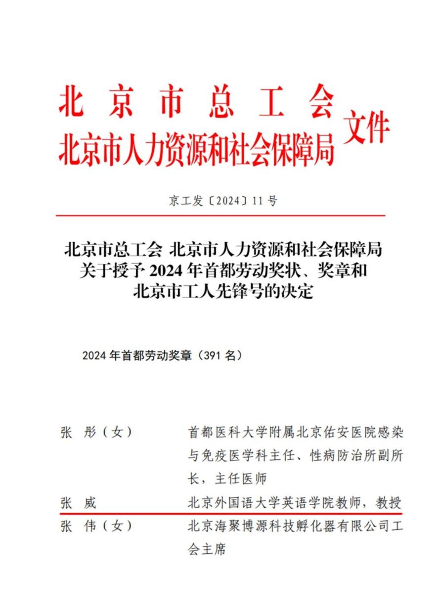 为深入学习贯彻党的二十大精神和中国工会第十八次全国代表大会精神,大力弘扬劳模精神、劳动精神、工匠精神,近日,北京市总工会、北京市人力资源和社会保障局在全市范围内开展2024年首都劳动奖状、奖章和北京市工人先锋号推荐评选工作,最终授予北京市76个单位“首都劳动奖状”称号,391名同志“首都劳动奖章”称号,授予148个班组(团队)“北京市工人先锋号”称号。Beat365唯一官方网站张威教授荣获“首都劳动奖章”,这是北外教师首次获得该荣誉。
