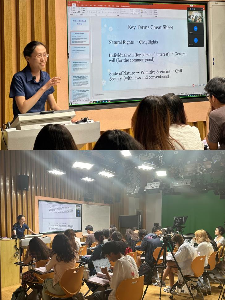 在直播课中,张丽文老师结合课文内容,深入浅出地讲解了社会契约论的基本概念与理论基础,用生动的实例引导学生分析该理论作为现代社会组织形式的基本特征及其与自然法和古代社会的区别与传承。基于问题的深度讨论、有效的师生互动等课堂组织形式,帮助学生加深了对课文语言、内容及哲学主题的理解,也为学生发展高阶语言能力、跨文化思辨能力提供了丰富、饱满的思想语境。