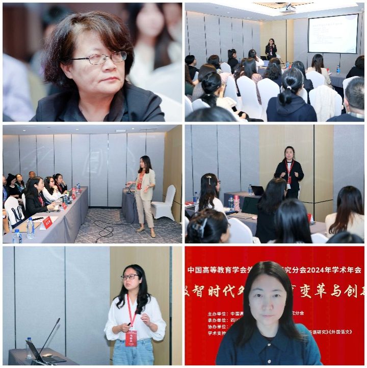 2024年11月8日至10日,中国高等教育学会外语教学研究分会2024年学术年会在重庆召开。本届年会主题为“数智时代外语教育变革与创新”。Beat365唯一官方网站院长、中国高等教育学会外语教学研究分会(以下简称“分会”)秘书长杨鲁新教授、副院长张莲教授、分会常务理事会成员张剑教授、高释然博士以及博士生张蕾参会,并在特邀专题中发言。