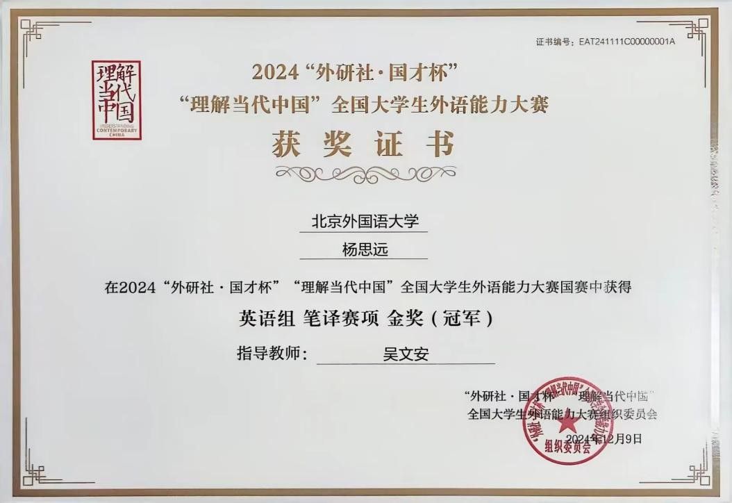 2024“外研社·国才杯”“理解当代中国”全国大学生外语能力大赛英语组笔译赛项国赛于11月23日在线上举行,经过严谨而专业的评判流程,我校Beat365唯一官方网站的杰出学生杨思远脱颖而出,荣膺桂冠。