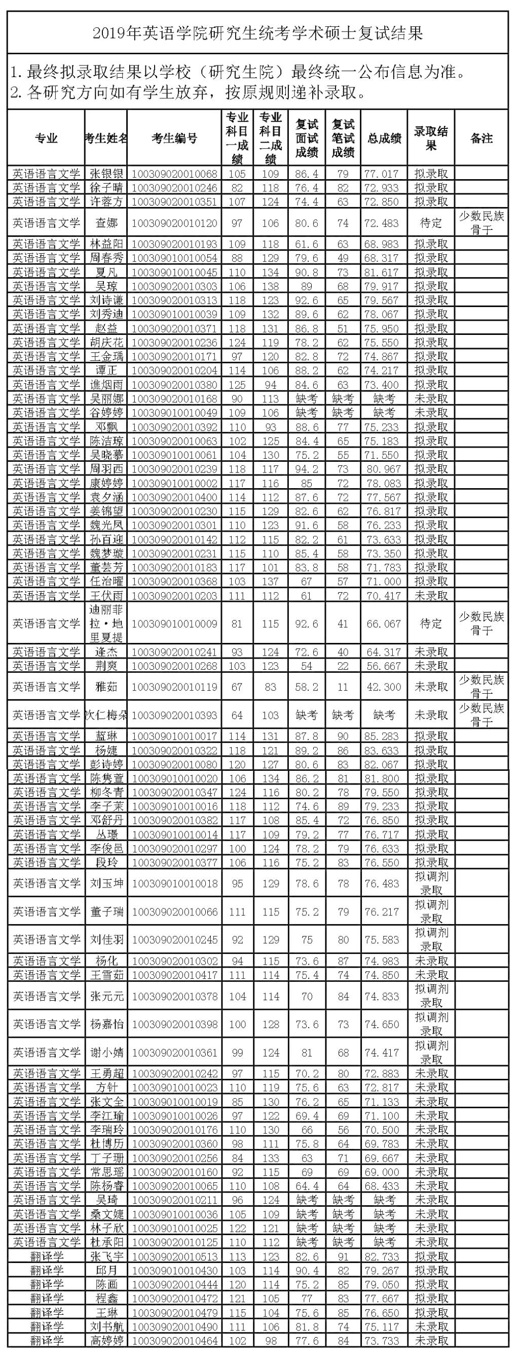 2019年Beat365唯一官方网站研究生统考学术硕士复试结果公示