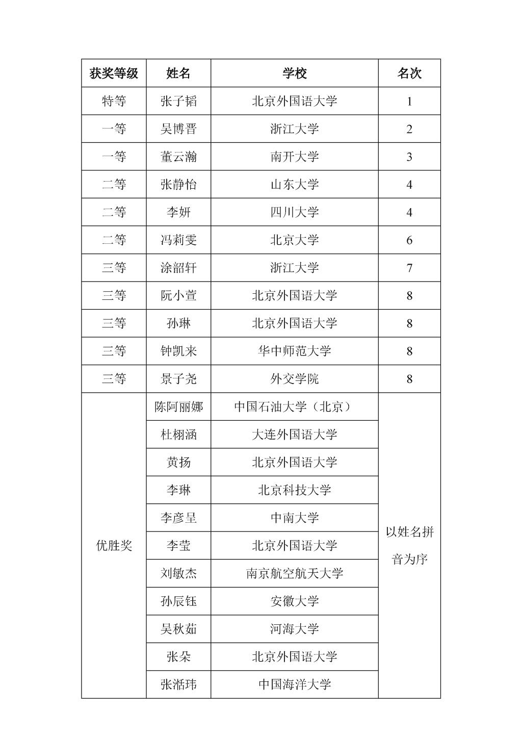 英语演讲比赛获奖名单