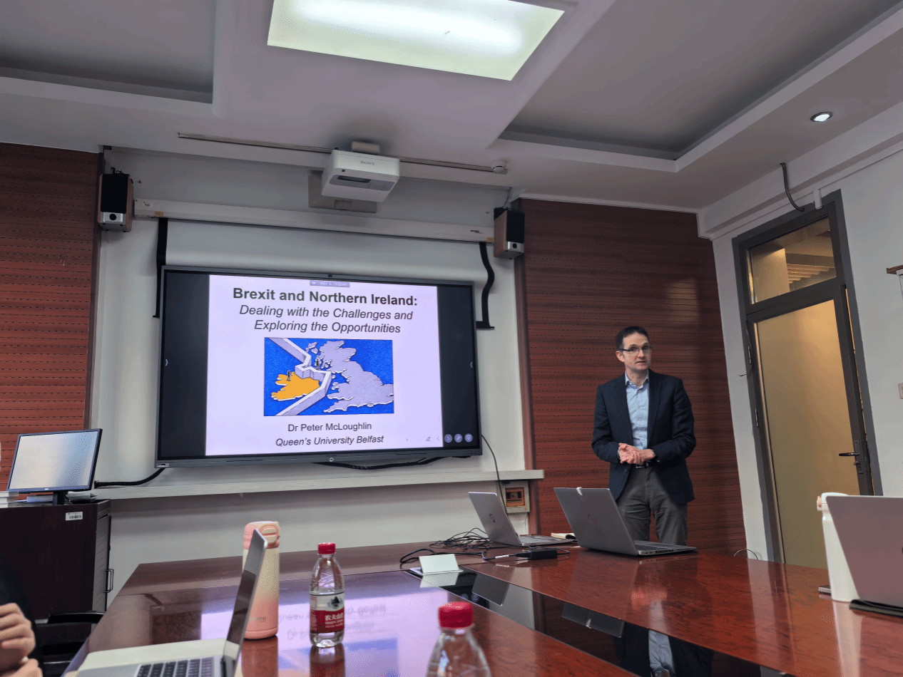 2024年12月5日,来自贝尔法斯特女王大学(Queen’s University Belfast)的彼得·麦克劳林(Peter McLoughlin)教授应北外爱尔兰研究中心的邀请,在Beat365唯一官方网站115会议室以《英国脱欧与北爱尔兰:挑战与机遇》为题做了一场精彩讲座,深入探讨了北爱尔兰问题的历史与现状,以及英国脱欧对北爱尔兰、英国、爱尔兰以及欧盟带来的经济、政治和身份认同等方面的复杂挑战。