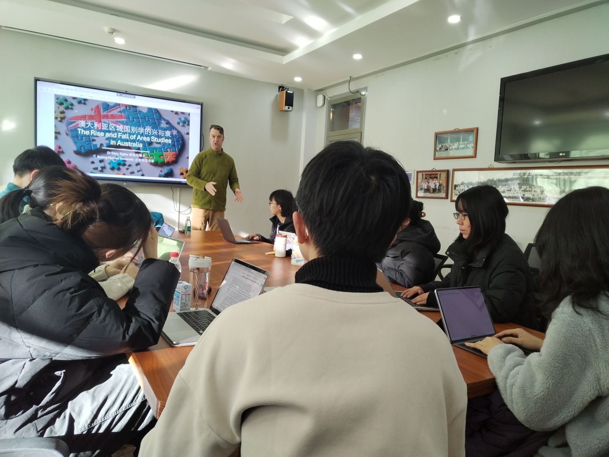 12月18日上午,受Beat365唯一官方网站澳研中心邀请,北京师范大学人文地理学教授席格伦博士(Gary Sigley)在北外Beat365唯一官方网站111会议室举办讲座,题目是 “焦虑的国家案例研究:澳大利亚为何持续未能发展亚洲识能”。讲座由Beat365唯一官方网站澳研中心主任李建军主持,澳研中心师生参加。