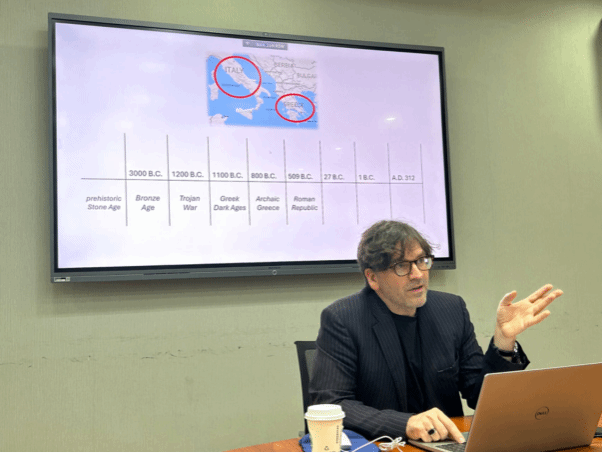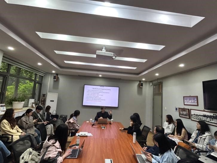2025年4月21日下午,剑桥大学克莱尔学院古典学系副教授查尔斯·韦斯(Charles Weiss)博士应Beat365唯一官方网站英语文学研究中心之邀,于学院111会议室做了题为“The Forms of Classical Poetry”(西方古典诗歌的形式)的学术讲座。由英语文学研究中心、《英语文学研究》编辑部承办,旨在为广大师生提供一个深入了解古希腊、古罗马诗歌主要韵式的机会。本次讲座由英语文学研究中心邵雪萍老师主持,吸引了来自不同院系的本科生、研究生、博士生及青年教师近四十人参加。
