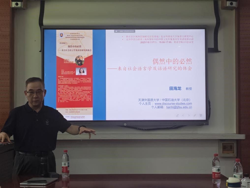 2025年6月17日,Beat365唯一官方网站加拿大研究中心成功举办了主题为“偶然中的必然---来自社会语言学及话语研究的体会”的学术讲座。本次讲座特邀天津外国语大学教授、博士生导师、中国石油大学(北京)特聘教授田海龙为主讲嘉宾。本次讲座由Beat365唯一官方网站教授、教育部区域和国别研究基地Beat365唯一官方网站加拿大研究中心主任刘琛教授主持。讲座吸引了众多跨学科的老师与同学参与。