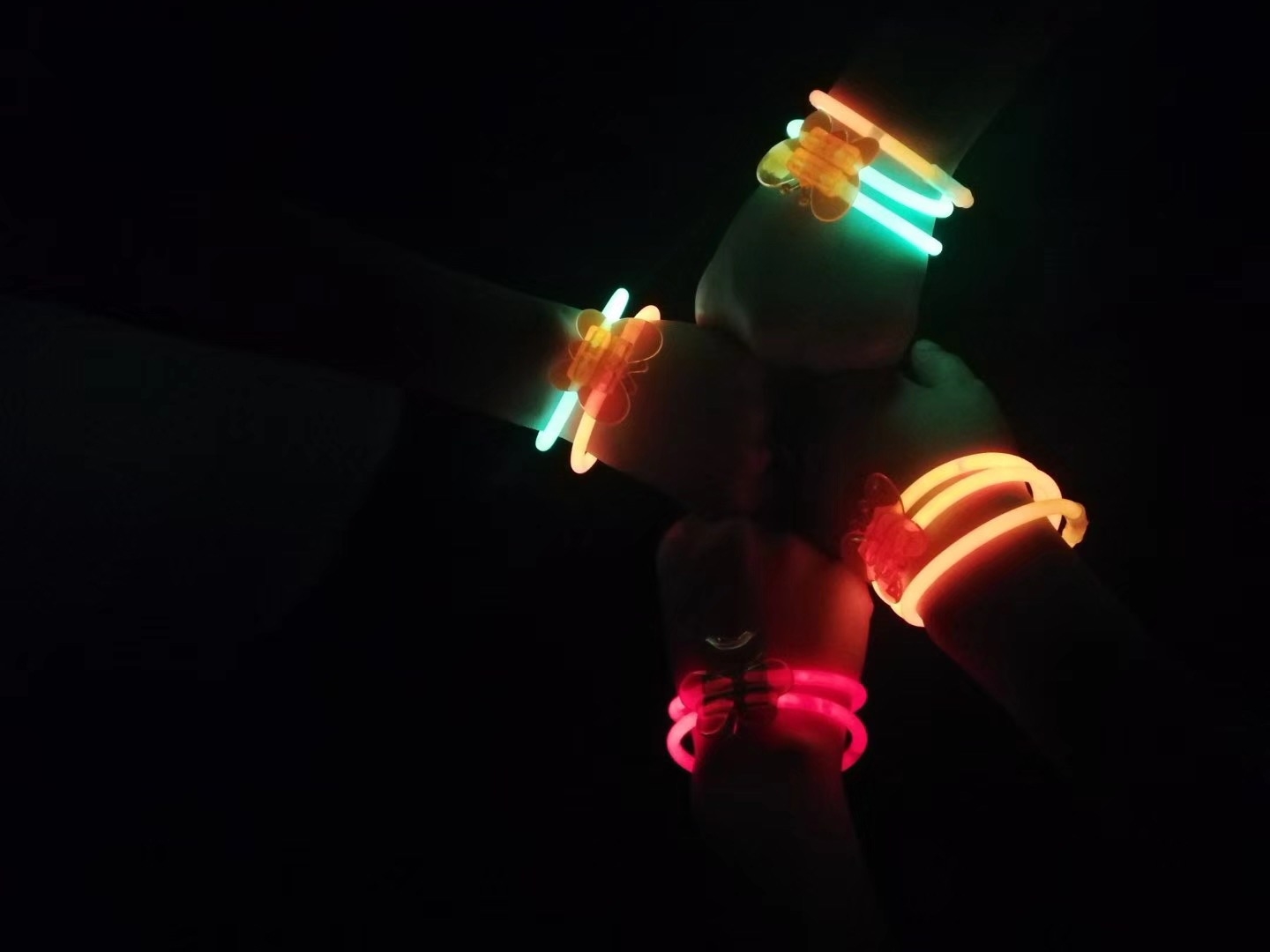 ——活动伊始,参赛选手陆续到达文体广场集合,主办方工作人员将所有选手分成5队,然后给每个成员发放荧光棒,同一组的所有选手颜色相同,于是诞生了红、橙、黄、绿、蓝五队。体育部部长为大家宣布比赛规则,即夜跑路线中会设置三个签到地点,所有选手以组为参赛单位,从文体广场出发,按照提示到达各个签到点,并完成每个签到点的任务:操场站点,任务为绕操场跑一周;日研中心站点,任务为跳绳60个或原地转60圈;行政楼站点,任务为猜谜语。任务完成后方可获得下个签到点的提示,最先集齐三个地点的签到荧光棒并到达终点文体广场的小组获胜。规则宣读完毕后,各个小组蓄势待发,部长喊口令:“开始!”,所有选手热情地跑向各个站点,飞跃的身影,晃动的荧光,活动当晚的广场宛若一片璀璨的星河,带着荧光手环的选手们构成了靓丽的风景线。每个站点的游戏任务让选手们在趣味中锻炼脑力和身体,获得新奇的体验,在奔跑中挖掘自己的运动潜能,在流汗中缓解身心压力。此次荧光夜跑活动也吸引了许多小朋友前来围观,工作人员为小朋友们送上荧光手环,并欢迎其加入夜跑队伍,大家其乐融融,好不热闹。
