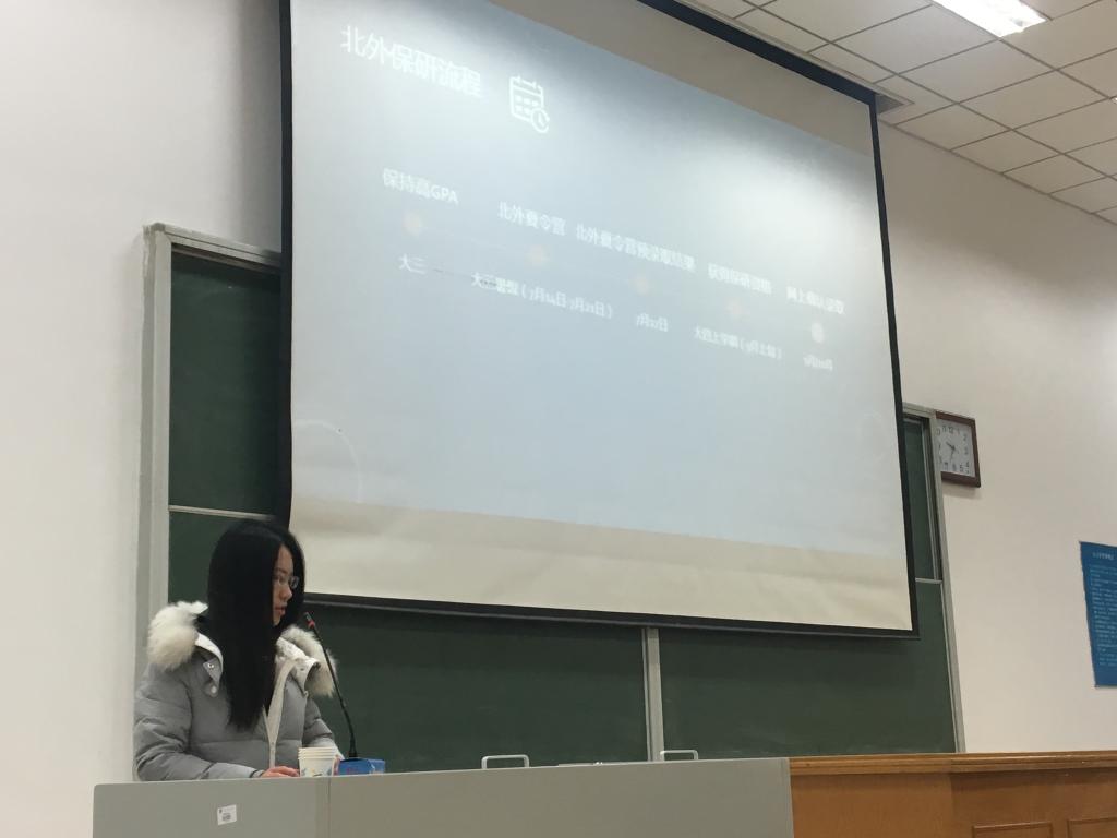 最后与同学们分享经验的是保研到北外国际商学院的吕芸萌学姐。她告诉同学们大三要学好专业课,在暑假积极参加北外国际组织夏令营或者其他学校的夏令营。同时介绍了北外夏令营申请的条件和录取情况。