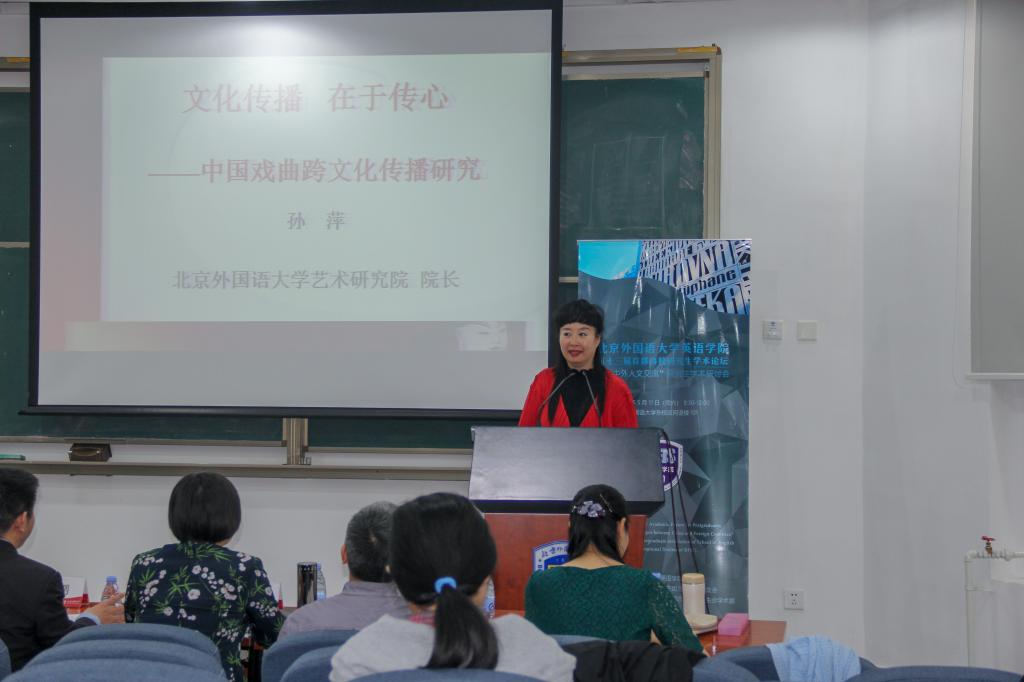 论坛首先由王展鹏老师致开幕词。王老师回顾了往届学术论坛的成果,鼓励英院学子好学深思,多参与学术活动,提高自身科研水平,希望同学们不畏艰险,勇于探索,实现更高层次的学术追求;同时关注时事热点,了解世界局势变化,拓展国际视野,从不同视角来思考国家的大问题。随后,北外艺术研究院孙萍院长做了主题为“文化传播,在于传心——中国戏曲跨文化传播研究”的主旨发言。孙萍院长是著名京剧表演艺术家,有丰富的舞台表演及文化对外交流经验,她在发言中分享了自己进行传统文化对外传播过程中的经历与感悟,让现场观众获益匪浅。