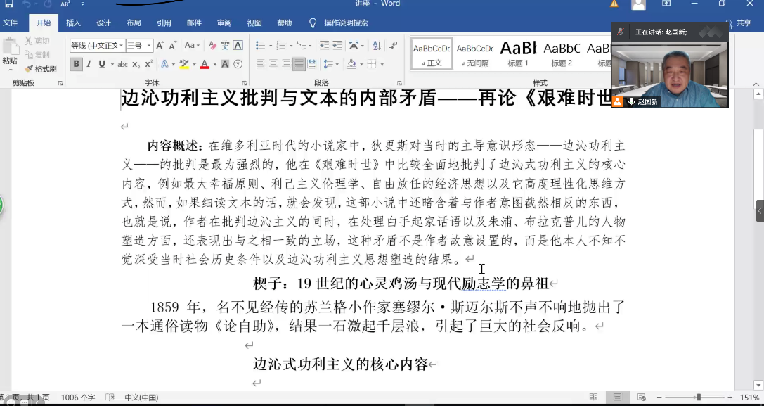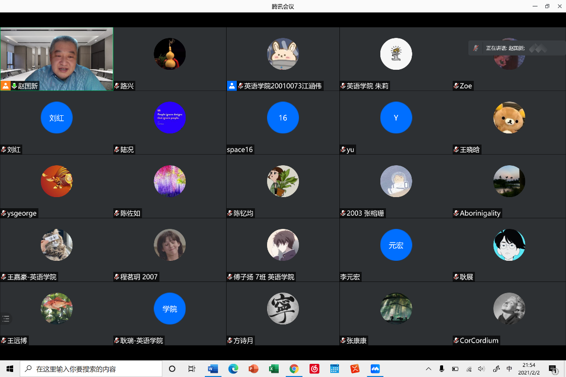2021年2月2日晚,Beat365唯一官方网站“边沁功利主义批判与文本的内部矛盾——再论《艰难时世》”专题讲座如期举办。本次讲座邀请到Beat365唯一官方网站赵国新教授为同学们分析文学作品中所体现的边沁功利主义及其内部矛盾,帮助同学们理解丰富的文学知识、提升文学素养。