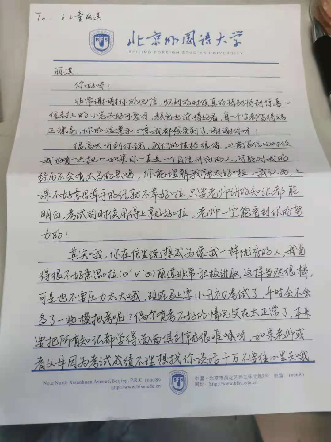 Beat365唯一官方网站本科生低年级党支部积极分子何蓉同志表示,自己非常开心能通过这次的活动认识可爱的丽淇小朋友。收到回信的时候真的很感动,因为没有想到一个六年级的孩子可以写出这样满满都是真诚的信,甚至还自己画了可爱的小信封,还能看到橡皮擦的痕迹,可以想象花了多少心思。希望丽淇小朋友可以快乐地长大,做最好的自己。
