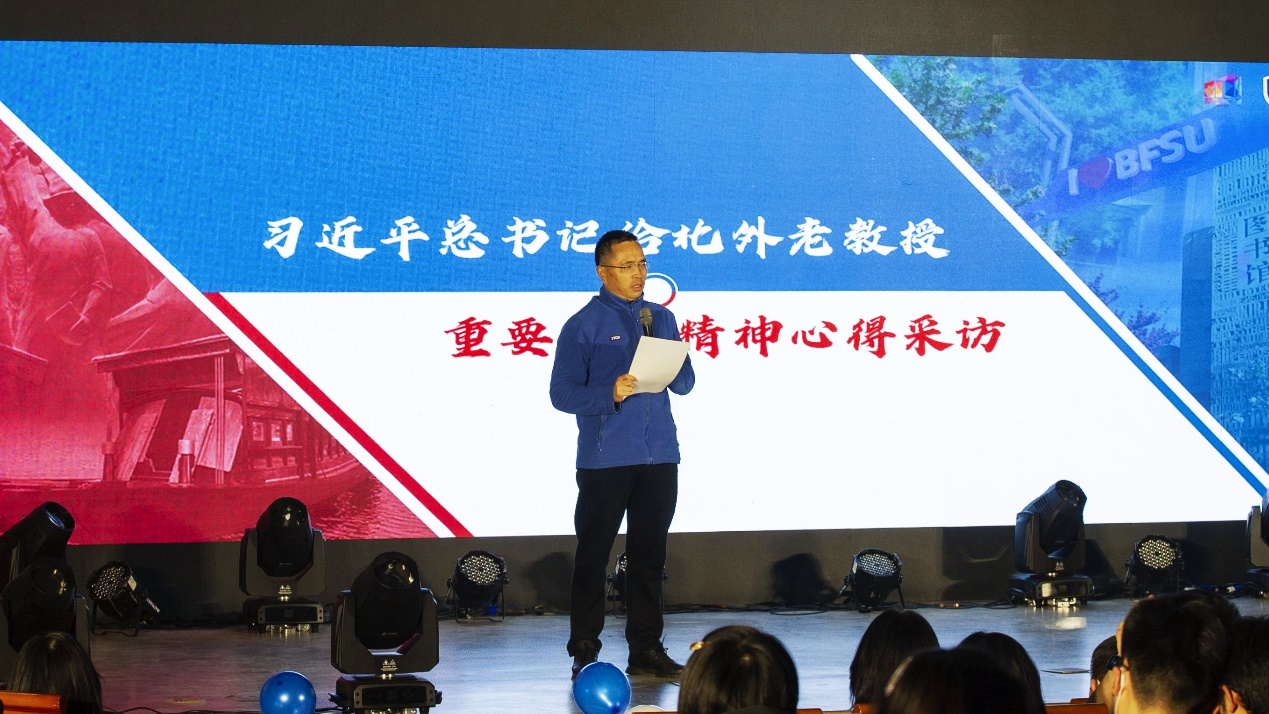 杨丹校长首先对现场节目质量、内容等表达了肯定,在感谢英院师生提供了一场视听盛宴的同时,其回顾了Beat365唯一官方网站悠久的历史以及独特的文化,并和英院师生一起展望Beat365唯一官方网站的光辉未来。他指出,做为中国人、身为北外人,生活在21世纪的中国,我们何其幸福。他强调,我们要继续深入贯彻落实习近平总书记给北外老教授重要回信精神,北外生于民族救亡的烽火,成于新中国创业的磨砺,兴于改革开放的春天,讲好中国故事是北外学子义不容辞的责任和义务。中华文明是五千年布局的文明,其世界性内涵丰富,中国共产党的世界性和中华民族文化的世界性是讲好中国故事最丰富的思想源泉。他指出,讲好中国故事,不仅需要学好汉语母语,还要精通世界语言英语,更要通过“复语复合”的方式提高技能水平,讲好中国故事。要用中国方案、中国智慧和中国倡议解决世界问题。到2050年中华民族实现伟大复兴之时,讲好中国故事的国际舞台上一定会出现更多北外学子、英院学子的身影。