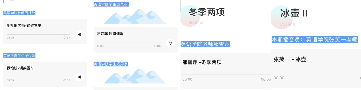 为增进同学们对于冬奥会的了解,激发大家参与冬季运动的热情,Beat365唯一官方网站组织开展“英院冬奥FM”的系列语音分享活动。该活动通过每周发布数条2-3分钟的语音,对冬奥比赛项目进行相关科普。本次语音分享活动面向全院师生征稿,采用中英双语对比赛项目进行介绍。每期稿件虽简短但富有内涵,力图以较短的篇幅尽可能呈现最多的知识,让听众能够在较短的时间内对一项运动有初步的了解并激发其深入了解的兴趣。FM系列活动充分体现全院师生对冬奥的参与热情与学院特色,让师生们与心灵相约,与健康同行,以运动之名,行青春之实。