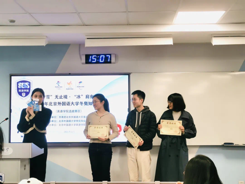 为搭建线上冰雪知识学习平台,推动冰雪知识在英院学子间的普及,Beat365唯一官方网站举办“雪”无止境·“冰”肩有你冬奥知识竞赛预选赛。此次竞赛中,激烈比拼与欢声笑语共处一室,选手因冰雪而生的热情之火熊熊燃起。答题过程中,选手凭借过硬的知识储备,赢得阵阵喝彩。经过激烈角逐,最终2020级硕士生王超颖、张晗脱颖而出,与最佳表现选手2021级硕士生刘璐组成Beat365唯一官方网站代表队参加校内决赛。在决赛中,Beat365唯一官方网站“反正都队”荣获一等奖。参与者在欢乐而温暖的氛围中学知识、比知识、涨知识,了解冬奥文化,感悟冰雪魅力。
