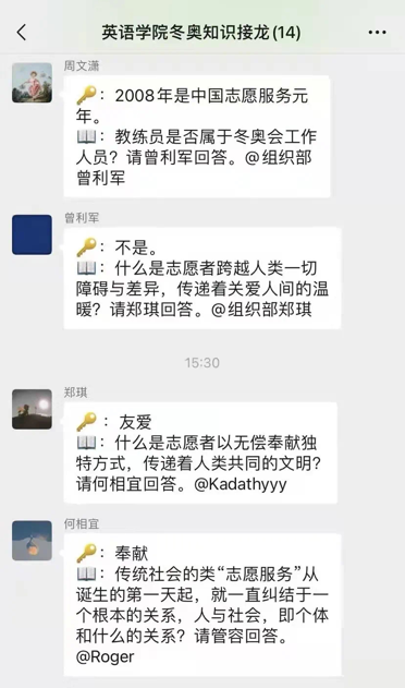在“三亿人参与冰雪运动”的指引下,为了迎接2022年北京冬奥会,进一步宣传冬奥知识,传播冬奥文化,提升北外学子了解冬奥、关注冬奥、参与冬奥的热情,学院组织开展冬奥知识接龙系列活动,参与者以线上接龙的形式进行答题,题目内容涵盖冬奥志愿者、场馆项目、冬奥历史等,还涉及到2022年北京冬奥会体育赛事等相关知识。此次冬奥知识接龙活动,普及了奥林匹克知识,传播了奥林匹克文化和理念,有助于北外学子树立北京2022冬奥会和冬残奥会主人翁意识,担负起宣传冬奥、弘扬奥林匹克精神的重任。