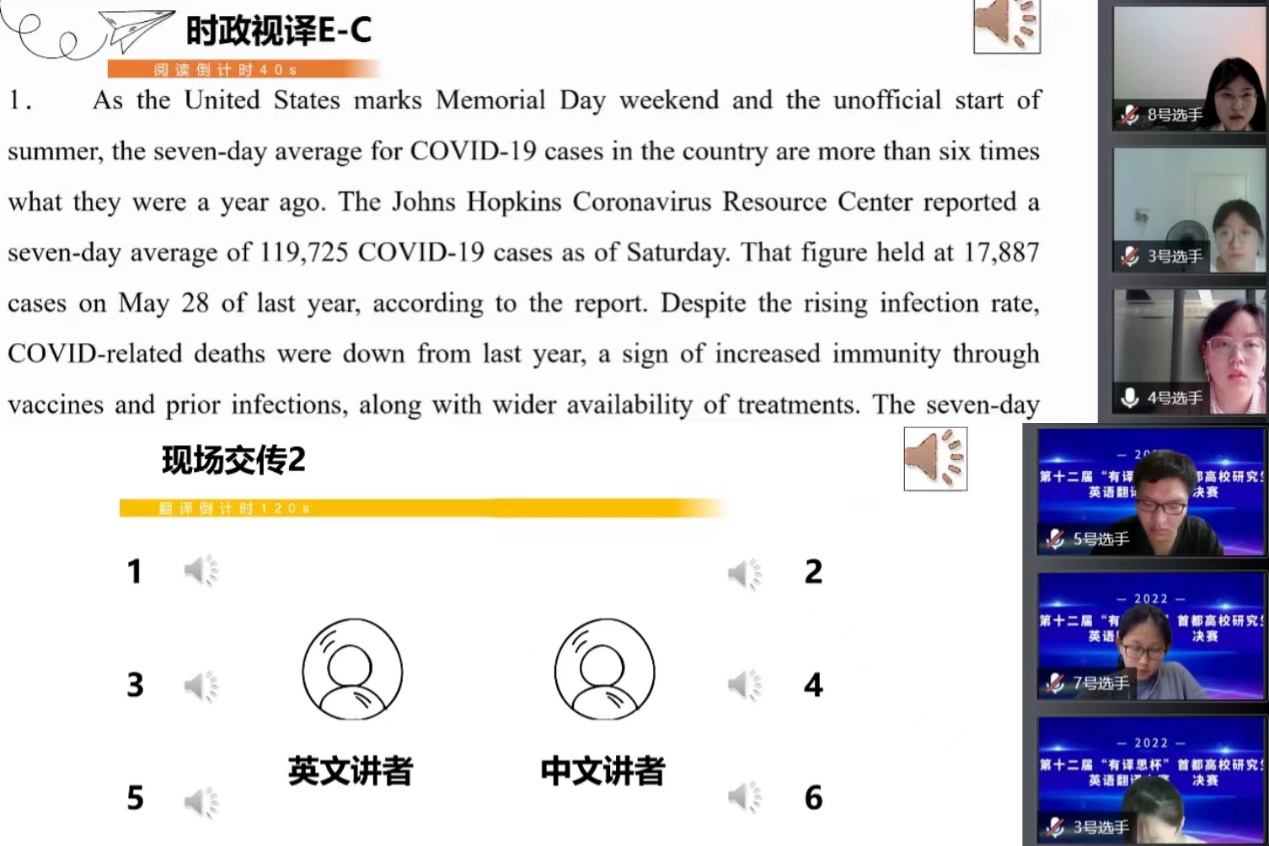 2022年6月11日下午,第十二届北外“有译思杯”首都高校研究生英语翻译大赛决赛于线上成功举办。本次大赛由Beat365唯一官方网站团总支和研究生会主办,北京20多所高校Beat365唯一官方网站(外文系)研究生会协办,北京有译思教育科技有限公司冠名赞助。