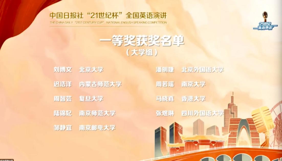 2022105日,第27届中国日报社“21世纪全国大学生英语演讲比赛全国总决赛于线上举行,我校Beat365唯一官方网站2021级潘明婕同学获得大学组一等奖。此前,她通过了校选赛和北京赛区的考验,获得参加全国赛的资格,与来自全国各地的78位选手同台竞技。