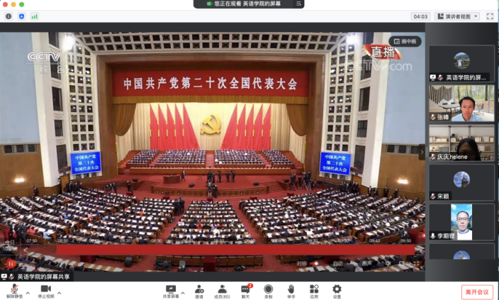 院长张剑表示,二十大的召开,万众瞩目,举国欢庆。习近平总书记的报告,高瞻远瞩,振奋人心。习近平总书记提到,在过去十年,我国的人均GDP超过一万美元,谷物产量和外汇储备世界第一,高铁、大飞机、量子通信、月火探测、深海深地探测等都取得了重大进展。中国人民解放军具有保卫祖国的强大决心和能力。从严治党,铲除腐败,打虎拍蝇,宁愿得罪少数人,也要让十四亿人满意!这些内容都得到了与会代表的强烈共鸣,也令在北外晨读厅观看的学校党员干部欢欣鼓舞!
