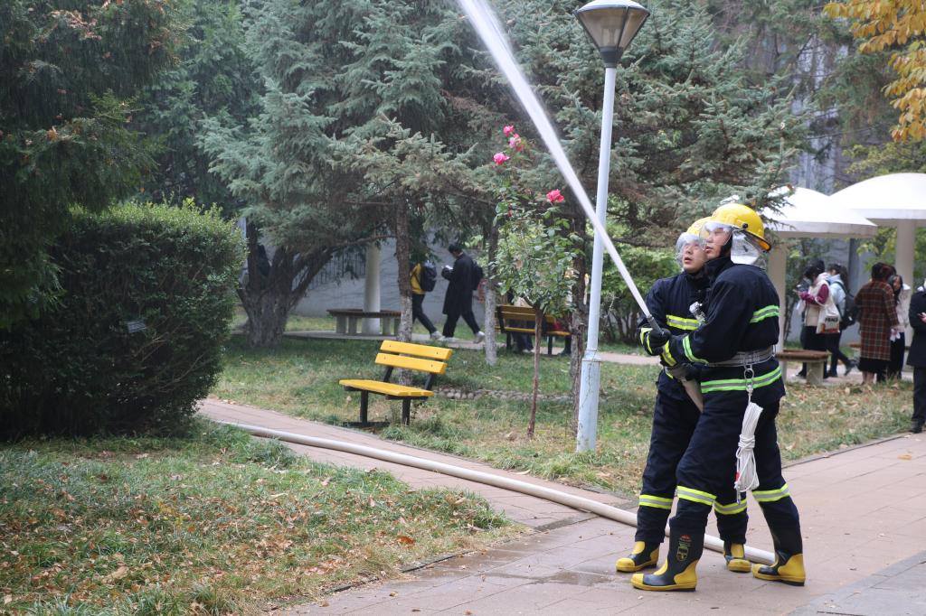 消防安全演习期间,保卫处及学院负责人到场指导、观摩。