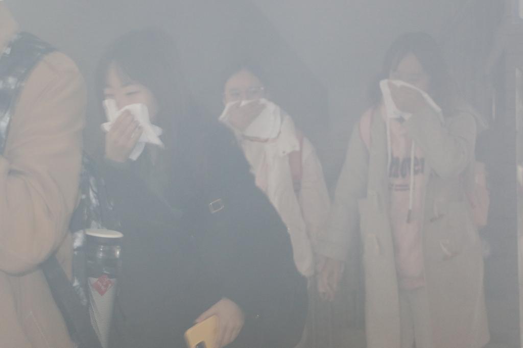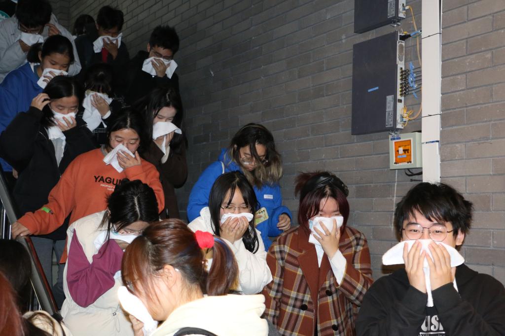 所有人员在4分钟内安全有序撤离英语楼,全体人员做到发生火警火灾时临危不乱、有序、迅速地按照消防逃生路线疏散,消防安全演习顺利完成。