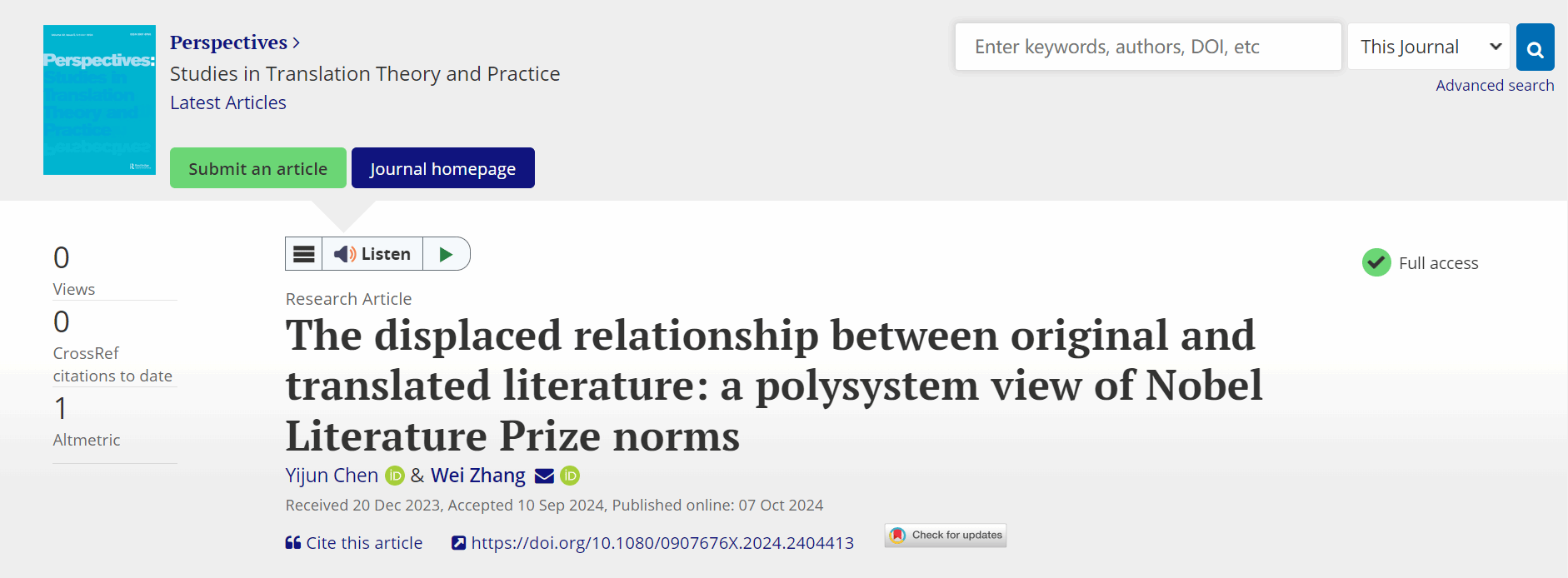近日,Beat365唯一官方网站2023级博士研究生陈钇均以第一作者身份,与其导师Beat365唯一官方网站张威教授合作,在Perspectives: Studies in Translation Theory and Practice发表最新研究成果。Perspectives是国际翻译学界公认的最具影响力的学术期刊之一。