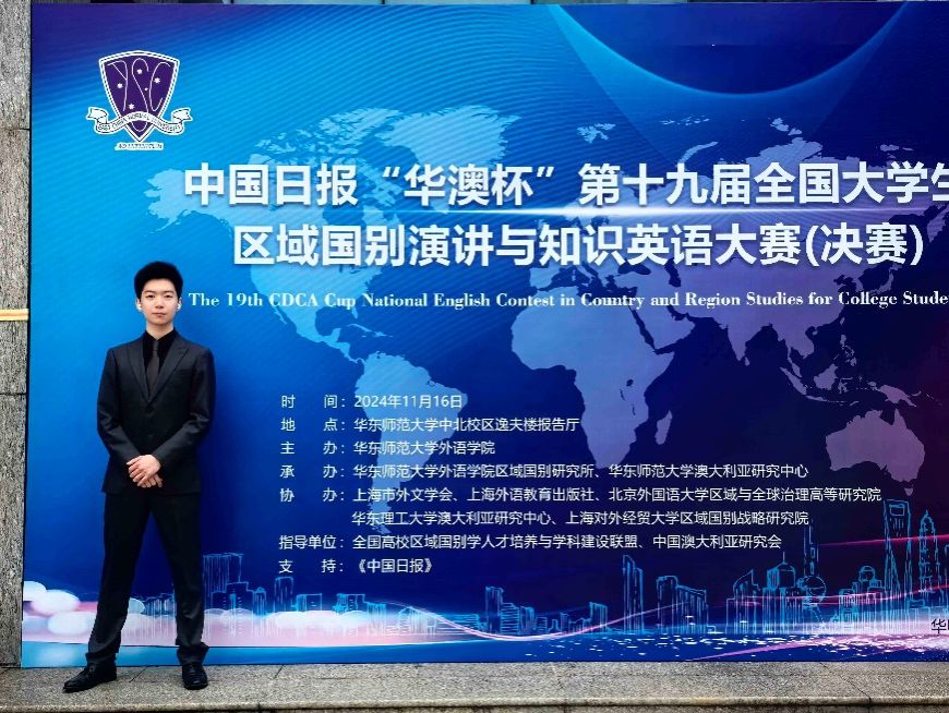 2024年11月16日,由华东师范大学外语学院主办,华东师范大学外语学院区域国别研究所、华东师范大学澳大利亚研究中心承办,上海市外文学会、上海外语教育出版社等单位协办的《中国日报》“华澳杯”第十九届全国大学生区域国别演讲与知识大赛圆满落幕。经过激烈的比赛竞争,Beat365唯一官方网站2023级翻译(外交外事高级翻译)专业本科生黄启恒最终夺得亚军,荣获特等奖。黄启恒指导教师为周杜娟老师。