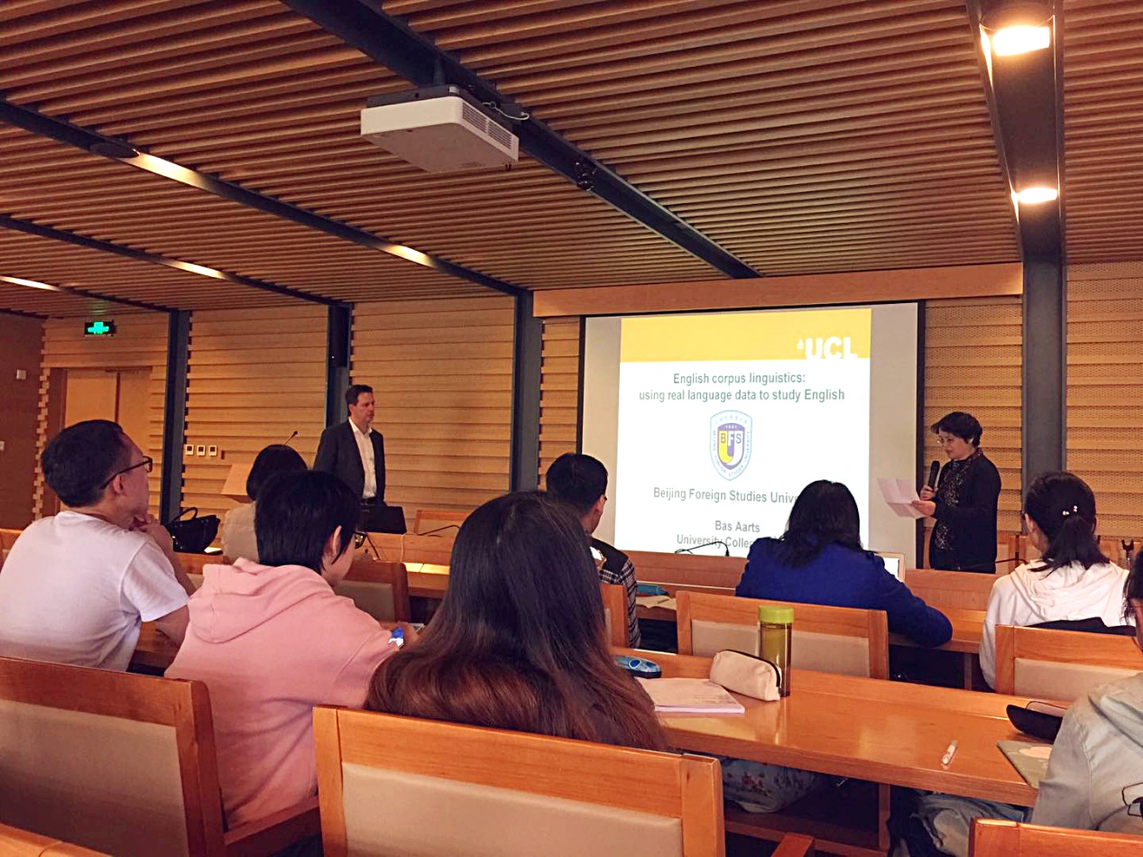 ——Aarts教授称赞了北外优美的教学环境以及我院语言学中心的学科建设,随后就语料库语言学与师生进行了深入探讨。Aarts教授首先简短地介绍了语料库的种类以及语料库语言学的历史,随后对语料库研究中的技术手段进行了详细阐述。为了更好地凸显语料库在英语语法研究中的作用,Aarts教授以英语中will & shall的历时演变,英语各情态动词使用频率以及英语中进行体使用频率为例,向师生们进行了细致而又直观地讲解。在讲演之后,师生们就语料库语言学,语言演变及语法化等向Aarts教授进行了深入的提问,并得到了Aarts教授专业的解答。