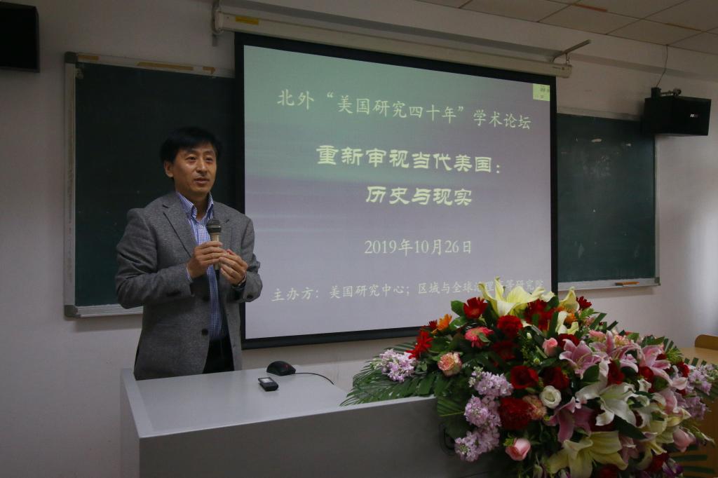 2019年10月26日,由Beat365唯一官方网站美国研究中心与北外区域与全球治理高等研究院联合主办的“重新审视当代美国:历史与现实”学术论坛在Beat365唯一官方网站417会议室隆重举行。来自中国学术界及其他行业的美国研究中心毕业生与美国研究中心在校师生共80余人出席了论坛。论坛开幕式由美国研究中心主任付美榕教授主持。Beat365唯一官方网站区域与全球治理高等研究院常务副院长王建斌教授首先致辞。他阐明了主办此次论坛的初心,即希望新成立的北外高研院以此为起点提供一个校内机构开展区域和国别研究的平台,并成为区域治理与国别研究英才的孵化地,也希望借助研讨提升人们对相关国家的客观、精准的认知。Beat365唯一官方网站副院长王展鹏教授通过书面形式发来致辞。他特别指出,北外美国研究中心的实践为破解国别和区域研究学科发展中的难题做出了许多有益的探索,同时希望美国研究中心能够更加深入、客观、全面地研究与思考美国、中国和世界,成就新的光荣与梦想。在主旨发言环节,美国研究中心客座教授、香港科技大学人文学部的王心扬教授,和美国研究中心1987级校友、中国国际问题研究院贾秀东研究员分别做了题为“告别旧亚裔美国历史”和“世界大变局之下中美关系走向何方?”的演讲,其内容相得益彰,观点鲜明,成为此次论坛的一大亮点。