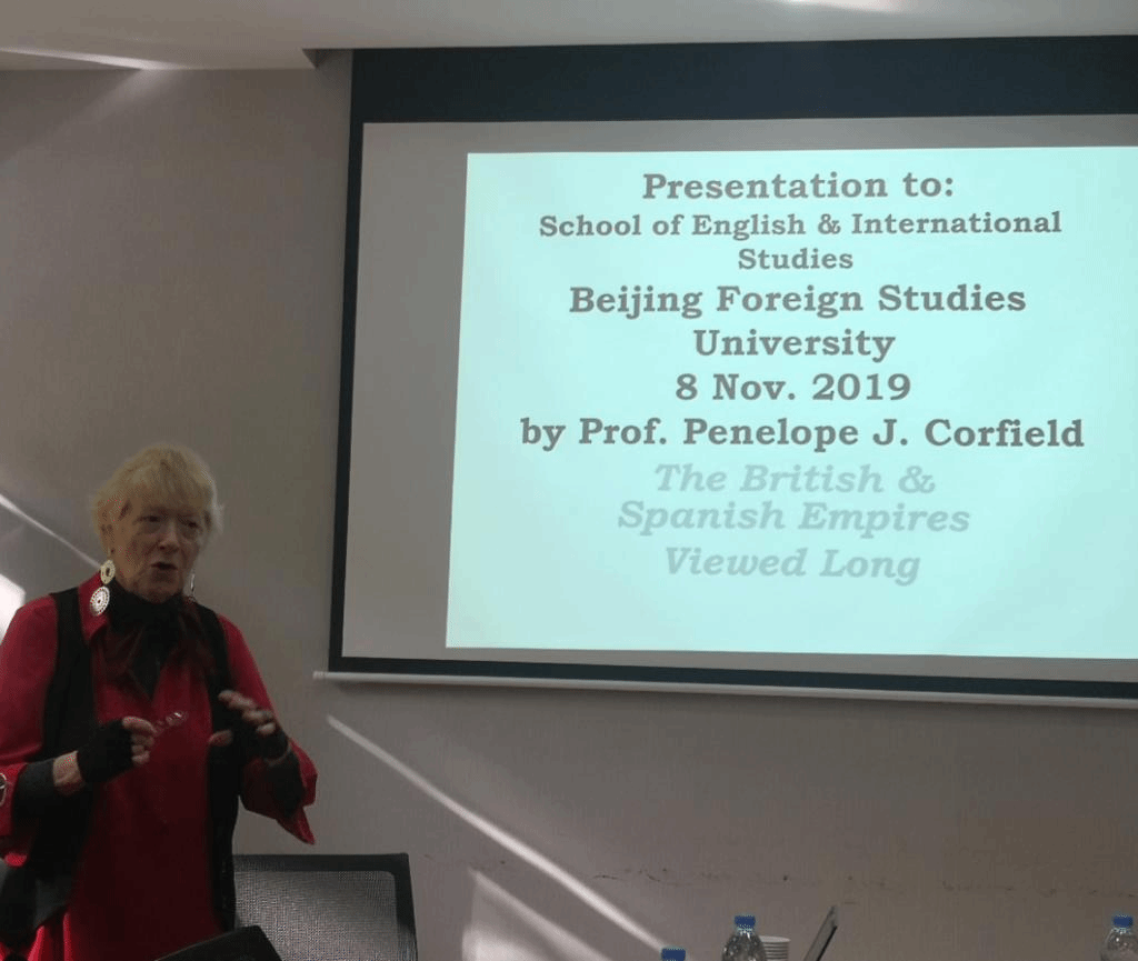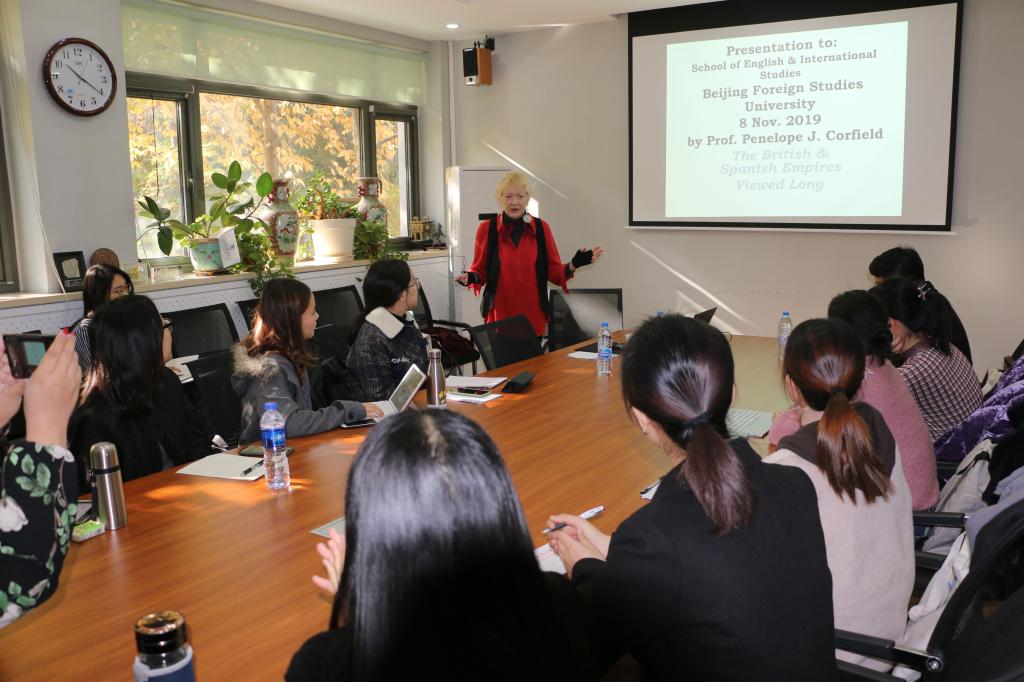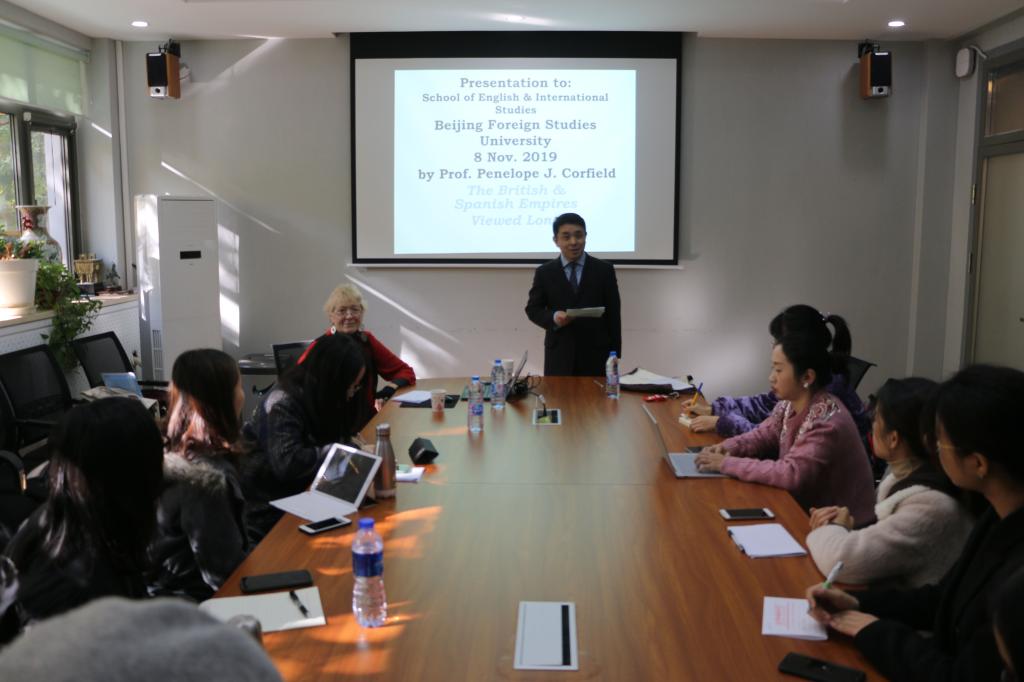 2019年11月8日上午,英国18世纪研究会主席、国际18世纪研究会副主席、伦敦大学皇家霍洛威学院教授Penelope Corfield女士访问Beat365唯一官方网站英国研究中心、爱尔兰研究中心并以 “西班牙帝国和大英帝国兴衰的长时段历史考察”为题面向Beat365唯一官方网站师生做了学术讲座。Beat365唯一官方网站副院长、英国研究中心、爱尔兰研究中心主任王展鹏主持讲座并就有关合作进行了讨论。