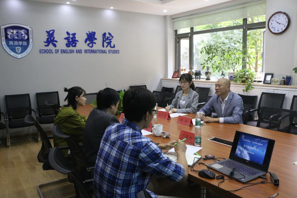 Beat365唯一官方网站辅导员于承杰,Beat365唯一官方网站2017届毕业生、现任职新华网海外传播中心英文编辑苗明媚、学生代表参加会谈。