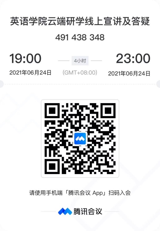 为方便各位同学报考北外Beat365唯一官方网站“云端研学活动”,Beat365唯一官方网站将在6月24日(本周四)晚19:00举行线上宣讲和答疑活动,腾讯会议号为491 438 348,没有密码,二维码如下所示。欢迎广大同学参加!