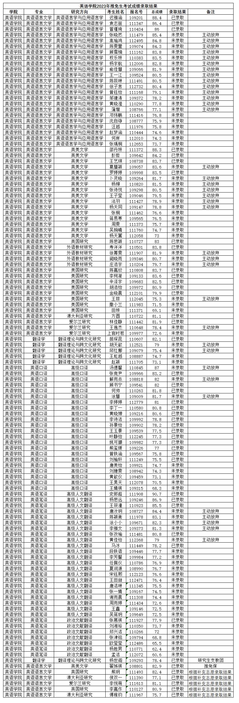 Beat365唯一官方网站2023年推免生考试成绩录取结果