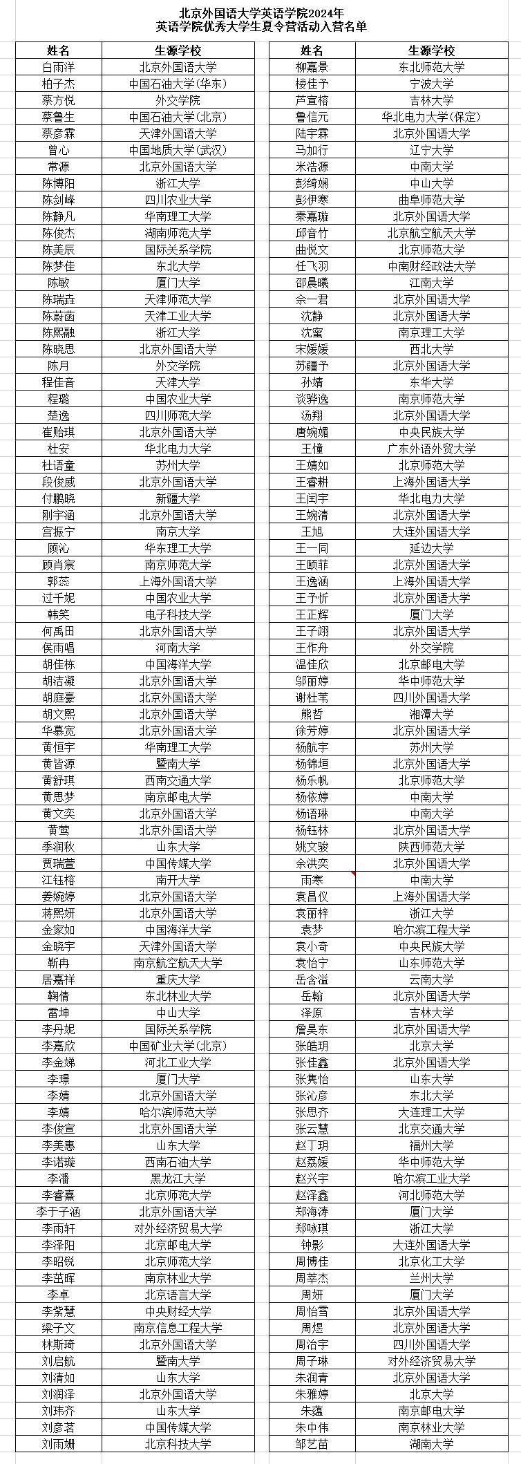 2024年优秀大学生夏令营活动入营名单