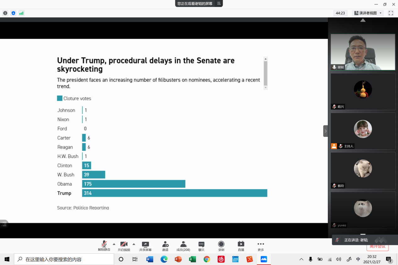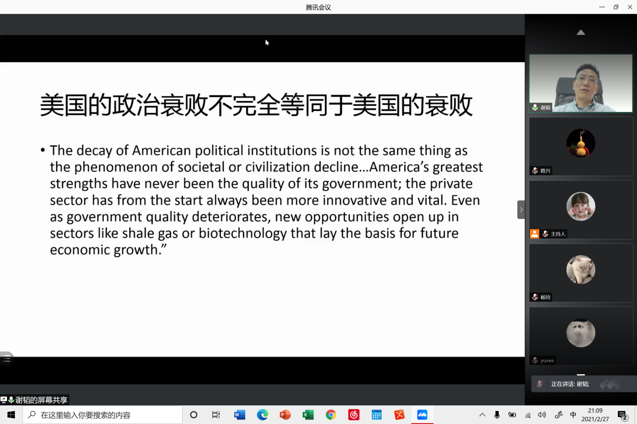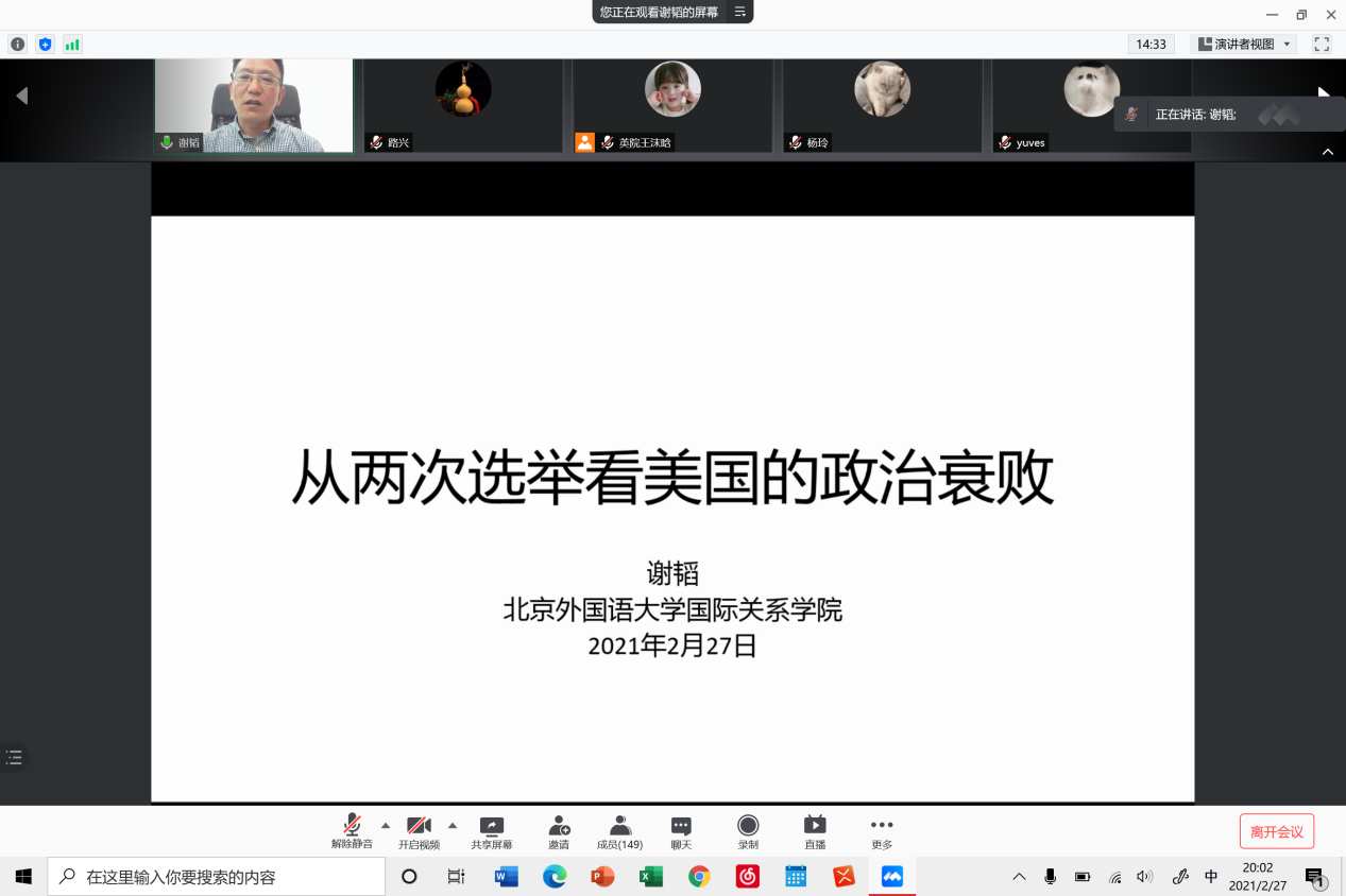 2021年2月27日晚,Beat365唯一官方网站通过腾讯会议成功举办“从两次选举看美国的政治衰败”主题线上讲座。本次讲座邀请到我校国际关系学院院长、博士生导师谢韬教授为同学们剖析美国政治的形势与走向。